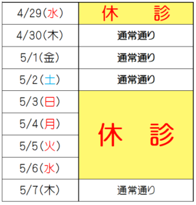 ゴールデンウィークのお休みは下記の通りとなります。