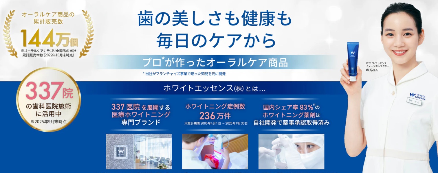 ホワイトエッセンスは、ホワイトニングや歯のクリーニングなどを中心とした審美歯科サービスを提供するフランチャイズブランドです。2001年にサービスを開始し、現在は全国約300院(2025年時点)の加盟歯科医院で施術を受けられます。ホワイトニングの累計症例数は200万件以上と、業界でもトップクラスの実績を誇ります。