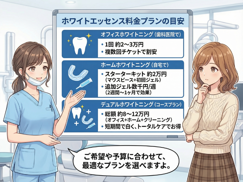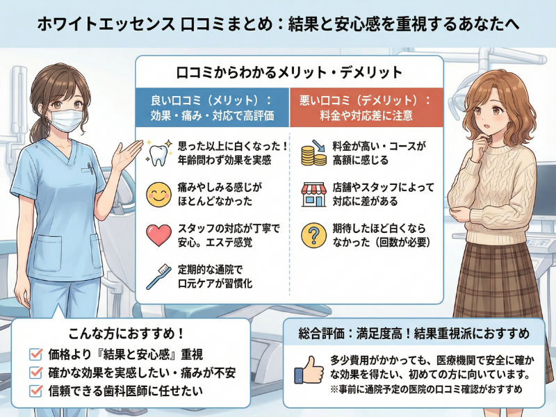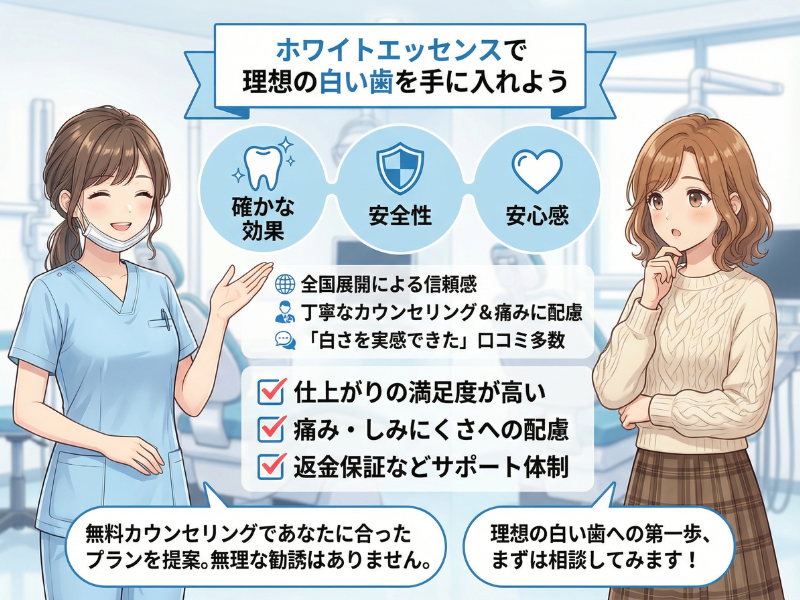という方でも安心して利用できます。初めてのホワイトニングで不安がある方ほど、丁寧なカウンセリングが受けられるホワイトエッセンスは検討しやすいでしょう。