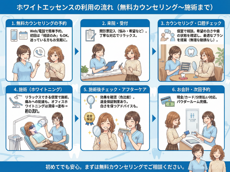 初めて ホワイトエッセンス を利用する方に向けて、予約から施術完了までの一般的な流れを紹介します。事前に流れを把握しておくことで、当日も落ち着いて利用できます。